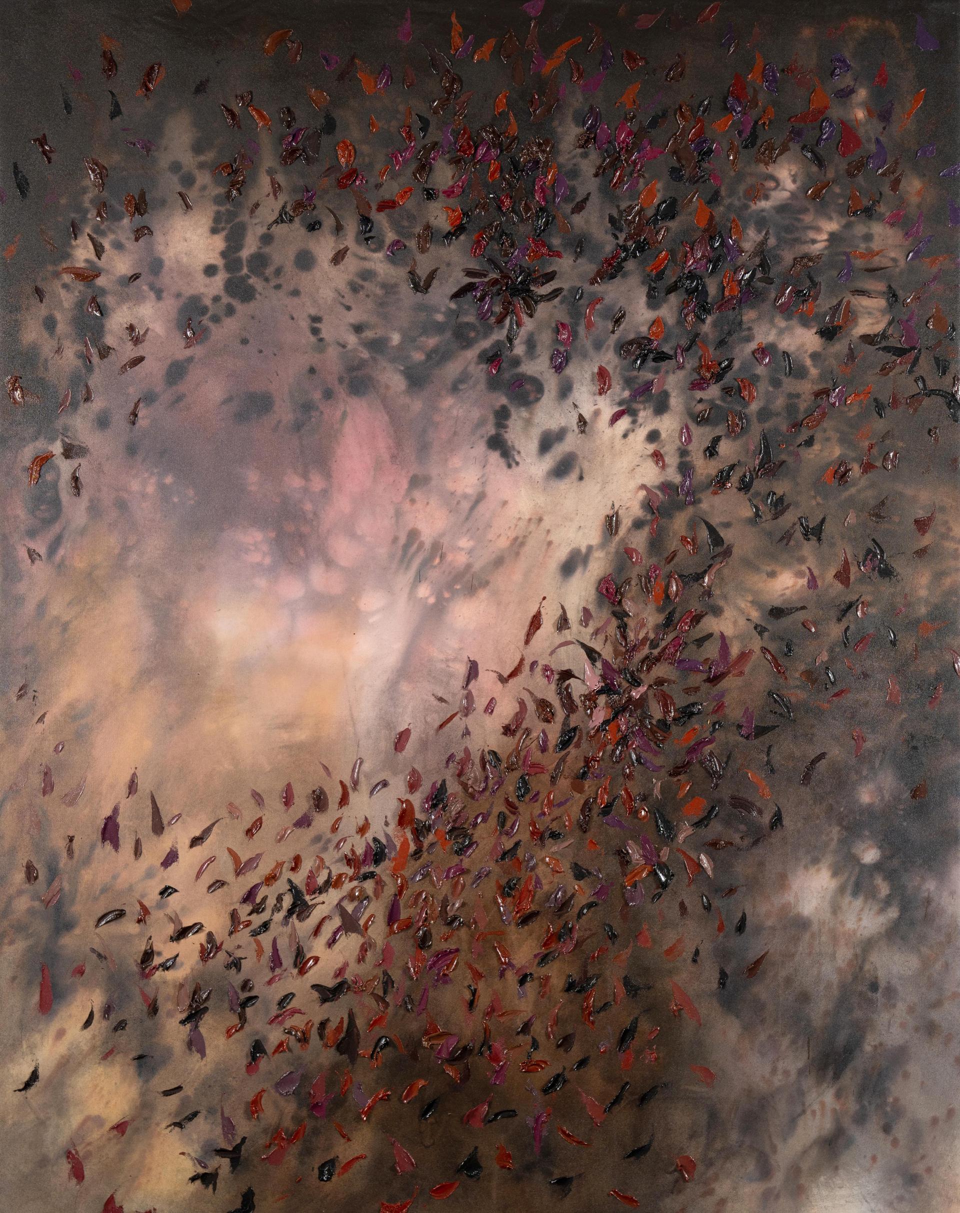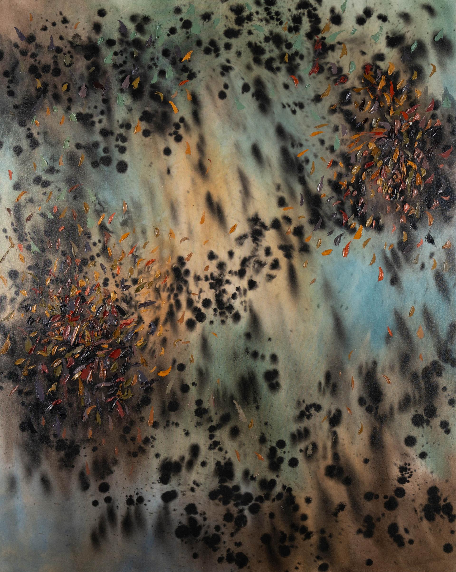 "Horder’s process is both technical and intuitive, developed over years of working mainly outside in the initial phase, with his canvases laid on a concrete surface. While his materials are traditional – watercolour, ink and oil – the catalysts are elemental – water, sunlight, heat and time.